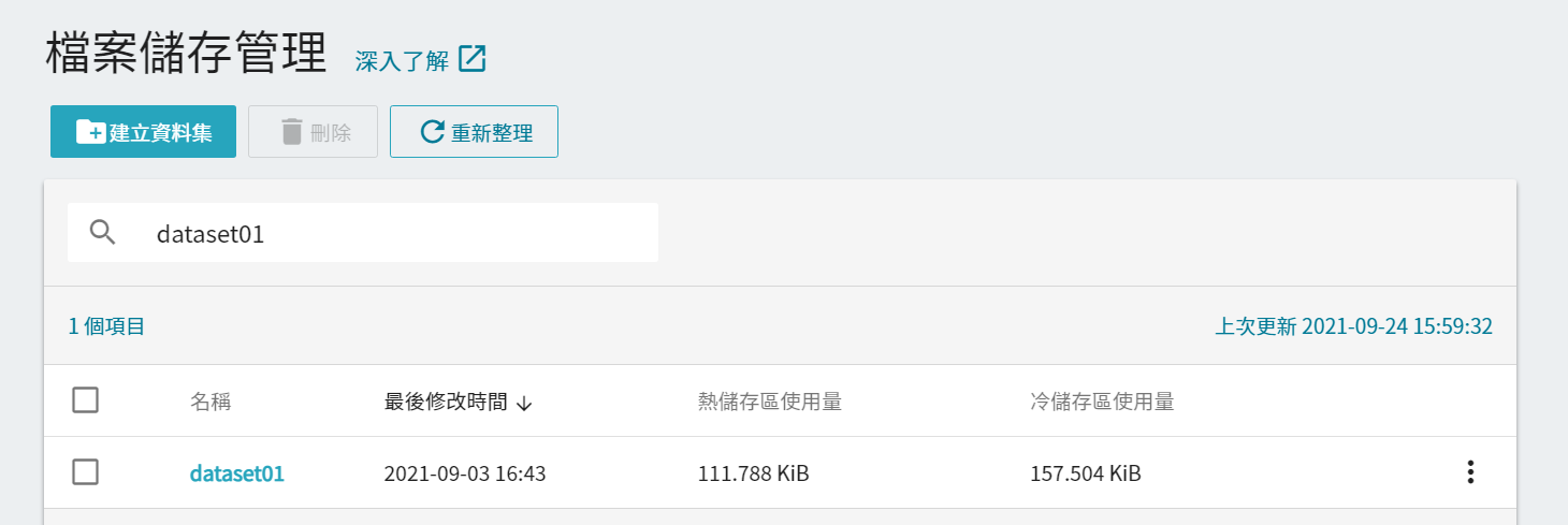 - 資料集建立完成後會出現在「檔案儲存管理」的列表中,點擊該列表進入資料集內容頁面即可開始使用。