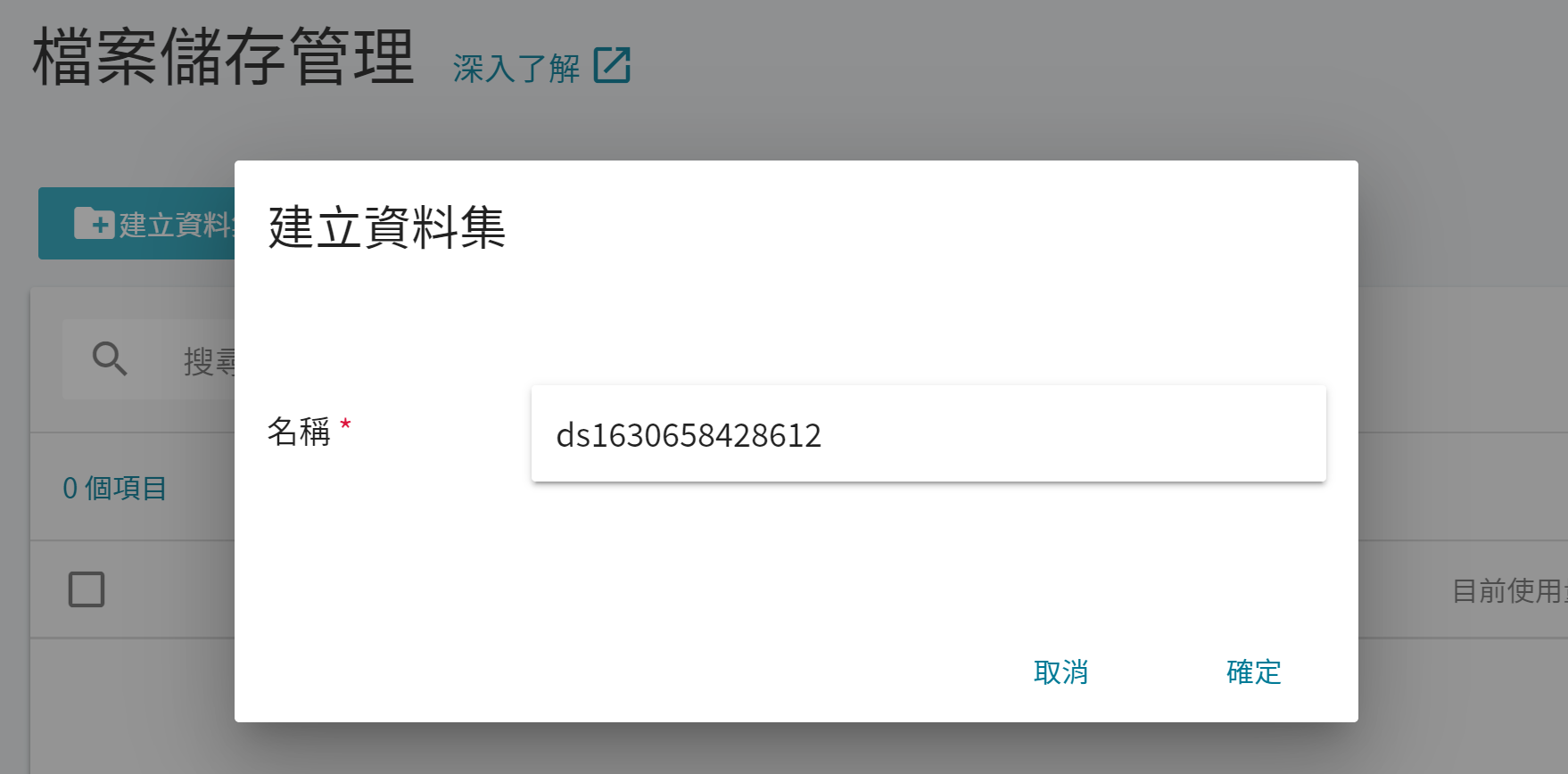 - 出現「建立資料集」視窗後,輸入資料集名稱後點擊「確認」。