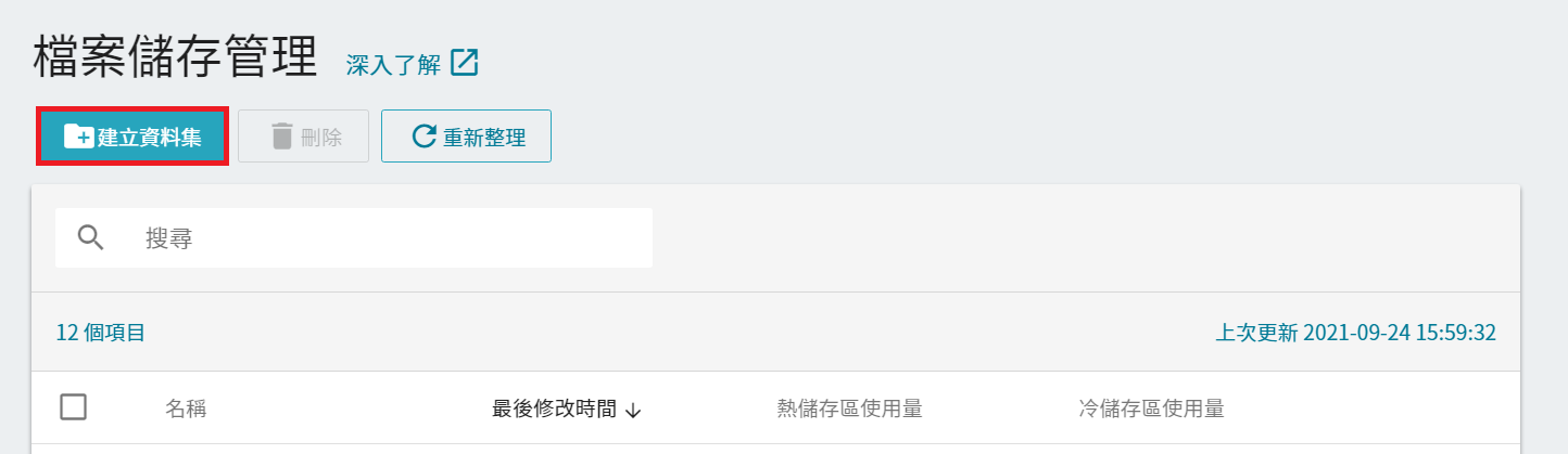 - 請在「檔案儲存管理」頁面點擊「+建立資料集」。