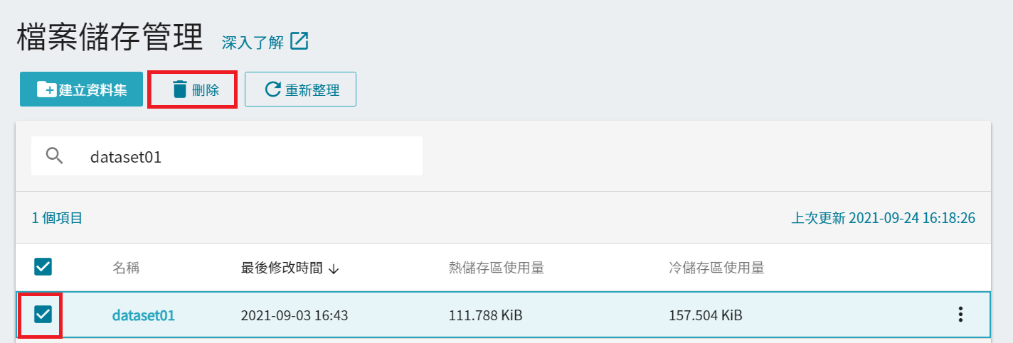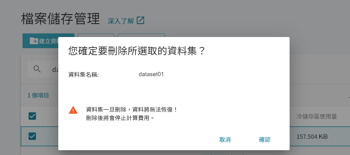 TWSC 雲端平台雲端檔案服務資料集資料集管理本頁導覽資料集管理雲端檔案服務儲存的階層可分為三大類:(1) 資料集 (2) 第一層資料夾 (3)子資料夾。 首次使用請先建立資料集,以將您的檔案上傳至雲端檔案服務。開始之前若尚未註冊使用帳號,請先註冊 TWSC。若選擇使用 TWSC 入口網站操作,請先登入 TWSC 入口網站。若選擇使用 TWCC CLI 操作,請先安裝 TWCC CLI、並登入删除資料集勾選欲删除的資料集,再點選上方的「刪除」按鈕,亦可勾選多個資料集一起删除。點擊「確認」按鈕。警告資料集一旦删除,資料將無法恢復,刪除後將會停止計算費用。