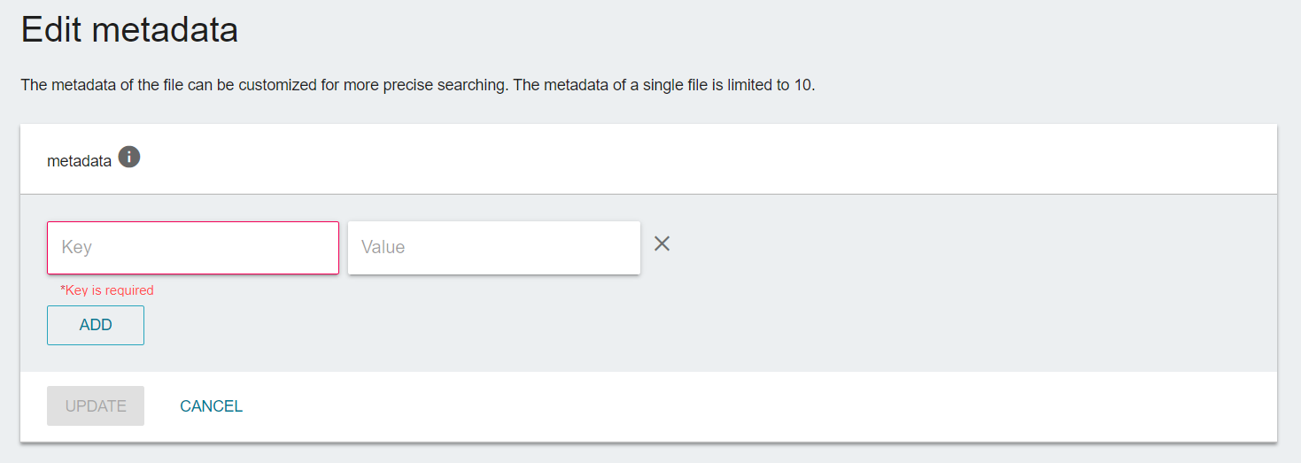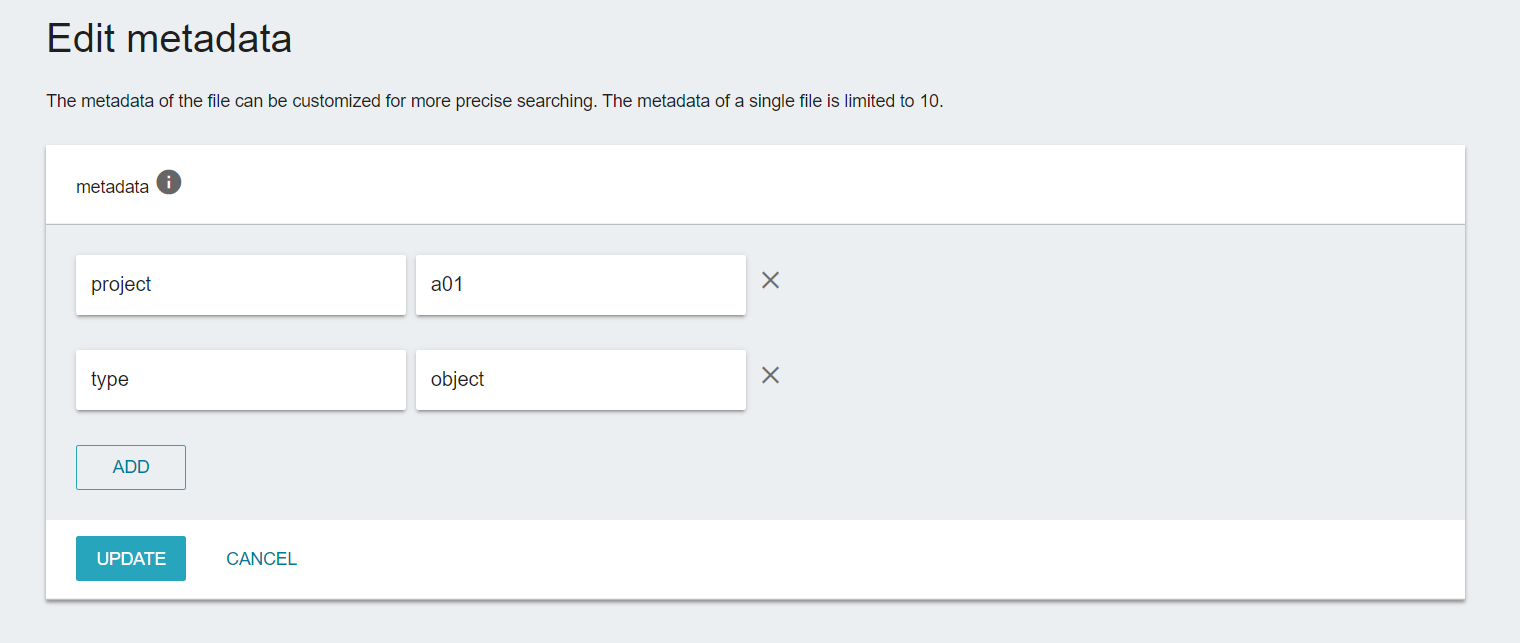 - Please follow the Key;Value format to enter or edit metadata. Click ADD button to add metadata and UPDATE button after finishing update.