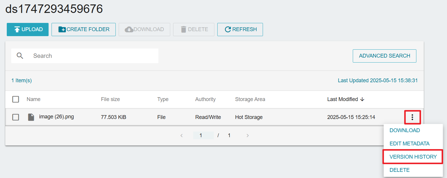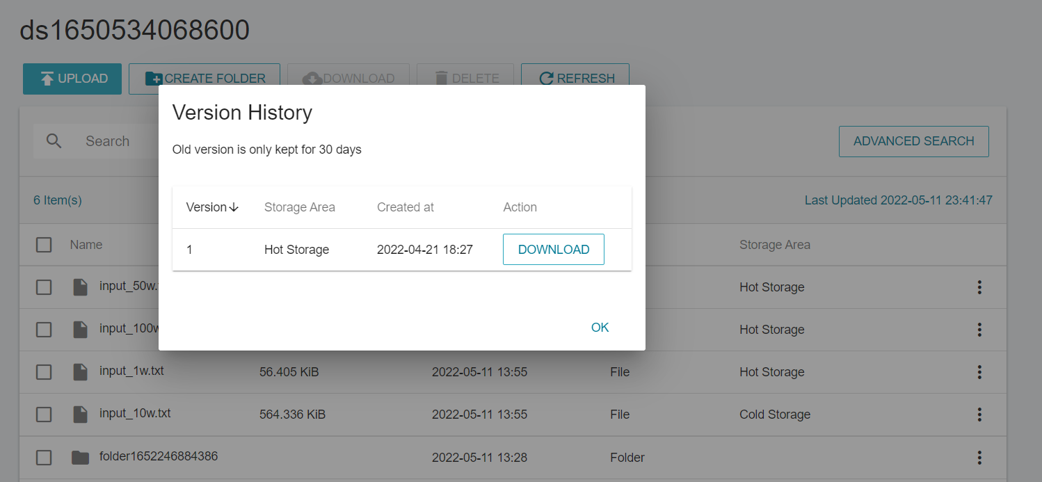 - Upload a file with the same name as the cold storage:New files will be stored in the hot storage and displayed on the file storage management; the original file is still stored in cold storage and can be viewed/accessed by clicking on the version record on the right.