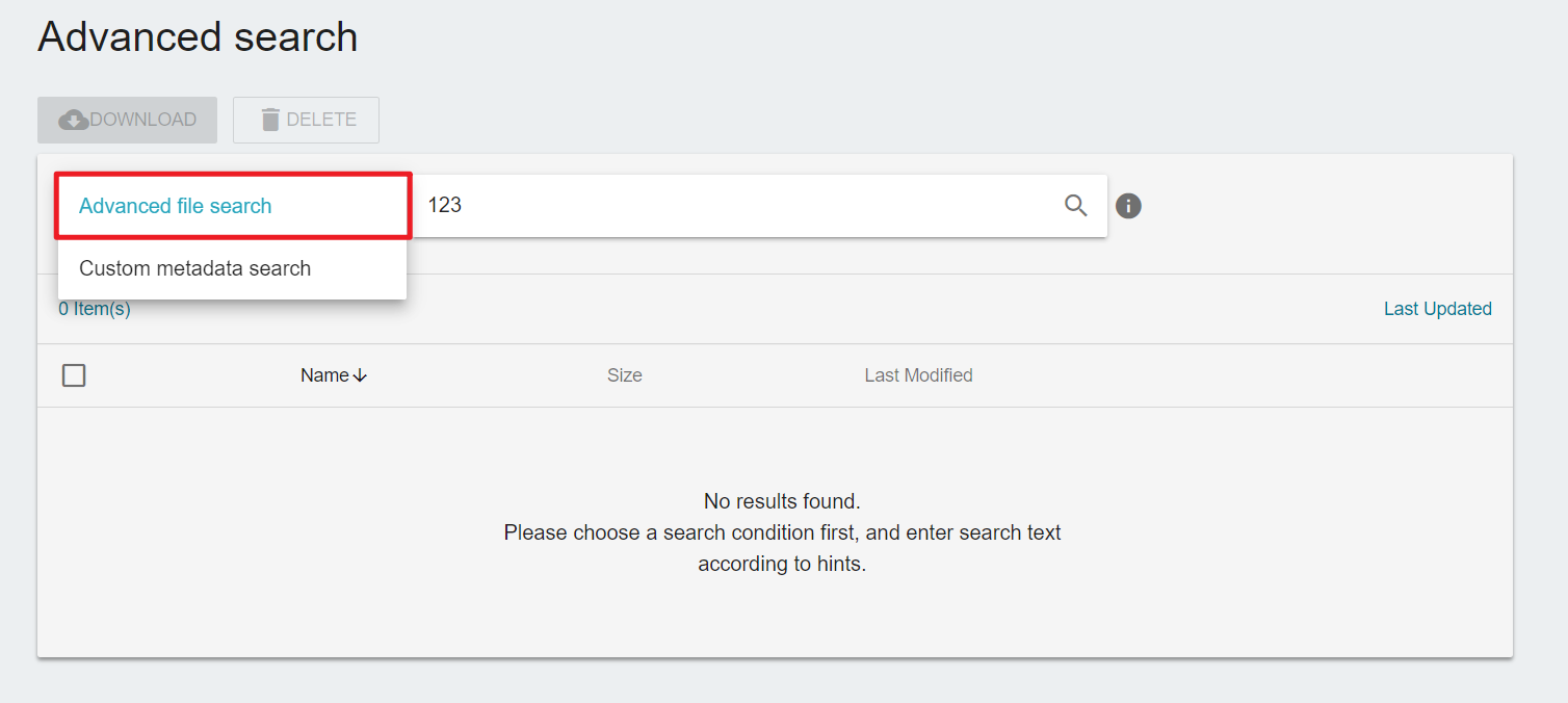 File Management Service provides two types of file search method, including Search (All dataset or specify dataset keyword) and Advanced Search (In specify dataset).
