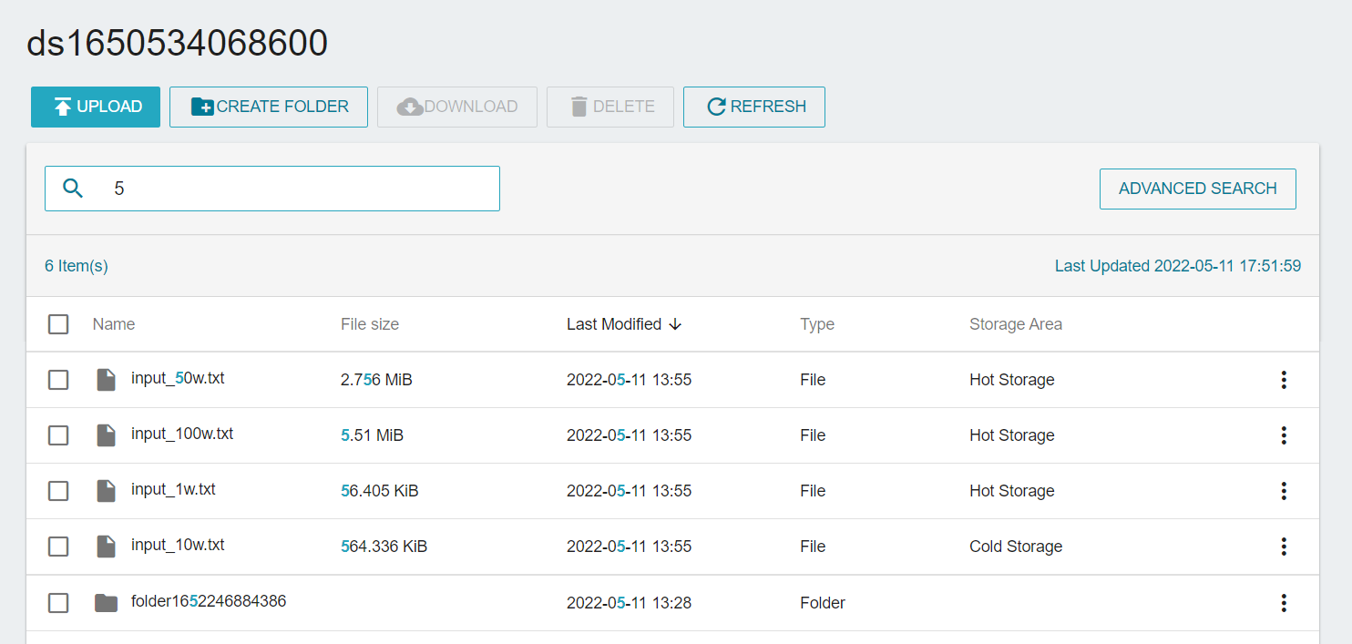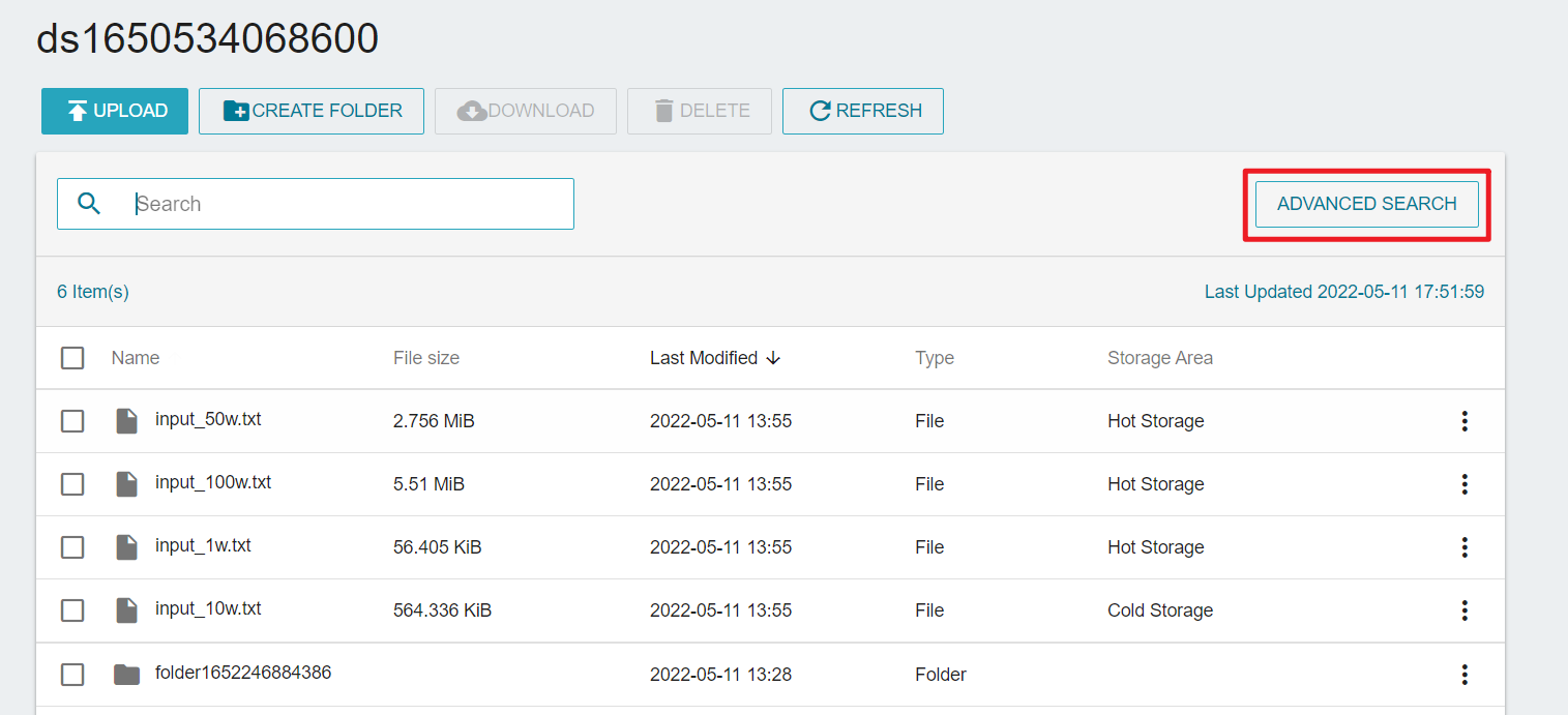 Advanced file search can perform a global search on keyword of the dataset. After entering the Advanced Search page, enter the keyword in the search box to search for all files containing this keyword.