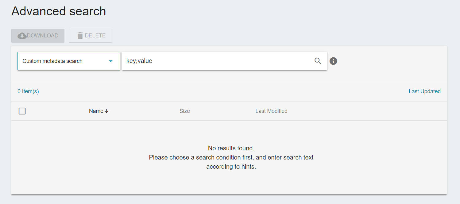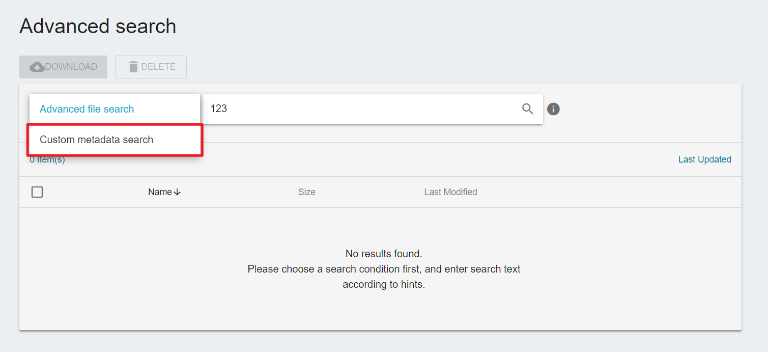 Custom metadata search can search by the key or value of custom metadata, click Advanced File Search to bring up the drop-down menu, and select Custom metadata search.
