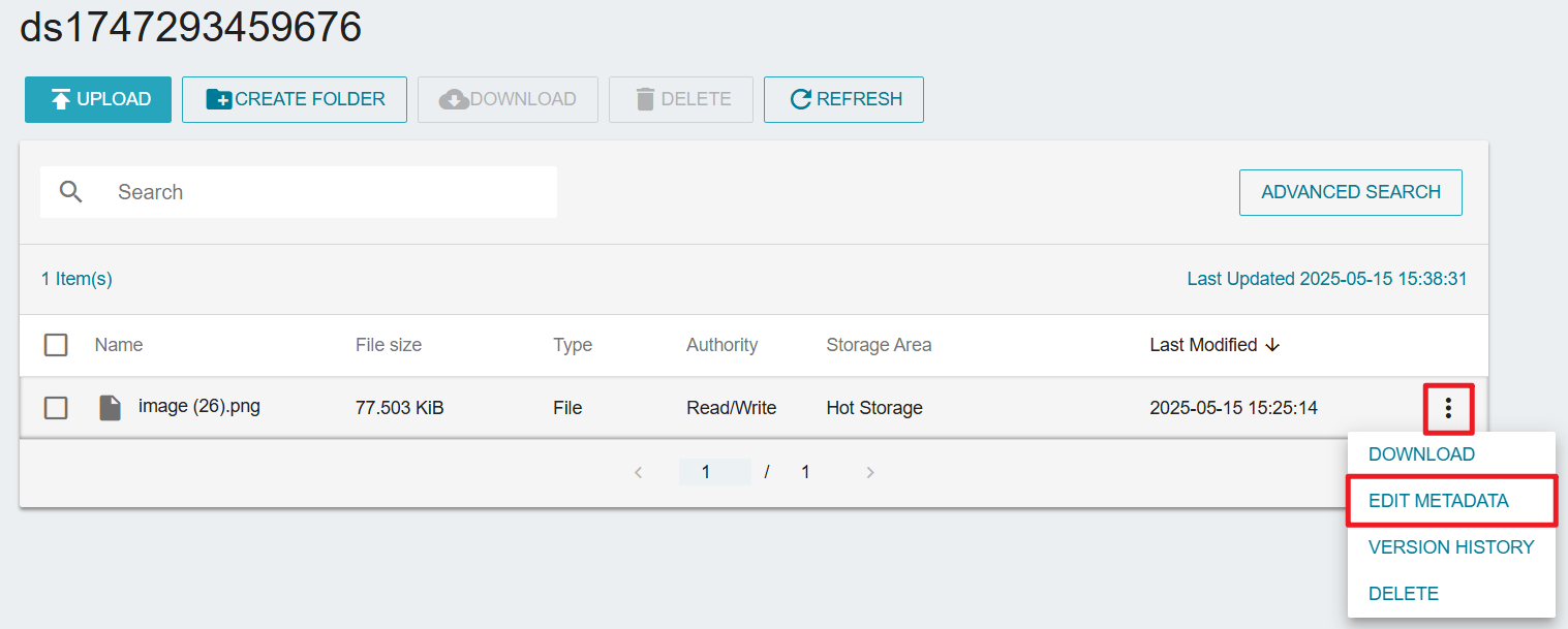 - Move cursor to the file's right panel menu button and click EDIT METADATA button on dataset page.